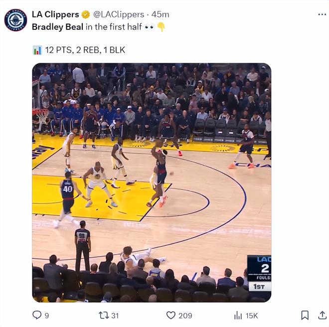 北京时间10月18日,NBA季前赛,快船VS勇士。这场比赛布拉德利-比尔迎来了自己快船生涯的首秀,他此前的三场比赛都是每日观察轮休,32岁的比尔是快船今夏重要的补强之一,此役他短短14分钟就拿到12分,展现了不俗的竞技状态。
